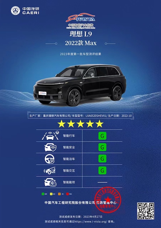 4月27日,中国汽车工程研究院股份有限公司(简称“中国汽研”),公布了IVISTA中国智能汽车指数2023年第一批次车型的测评结果。理想L9在测试的智能行车、智能安全、智能泊车、智能交互四个项目中,得到了四个“G”(优秀)评价,获得了五星智能星级评价。其中在智能安全测试中,理想L9是中国智能汽车指数已经测试的车型中得分最高的车型,而且也是首个获得4个G评价基础上又获得导航辅助驾驶测评G+ 的车型。而理想L9也成为IVISTA中国智能汽车指数成绩最高的车型。