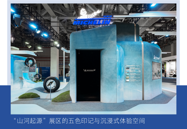 今年进博会,米其林以中国水墨与山河意境为设计灵感,融合未来科技感,首次以复合物为核心叙事,将抽象的复合物科技转化为可感知、可互动的沉浸式创新体验。展台从轮胎的五种核心材料出发,提炼出五色印记,既象征材料性能,也呼应山河意象,材料的精密融合铸就轮胎这一终极复合物;自然元素的壮丽交融,融绘成永续山河的壮阔画卷,传递米其林对可持续发展的坚定承诺。