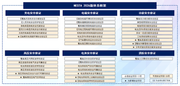 基于过去一年技术验证实践成果,结合真实交通事故案例分析和三电系统技术发展趋势,NESTA 2026版在测试方法上进行重大创新,增加工况串联测试模式,确保技术验证与实际使用场景高度契合。在保持2025版技术框架的基础上,NESTA 2026版精简整合5个验证项目,根据行业发展需求增设多个测试模块,最终形成包含11个核心验证项目、27个可选测试内容的完整技术体系,以适应企业差异化、场景化的技术验证需求。