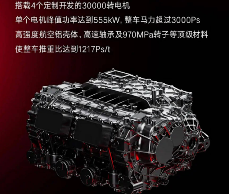 新车采用全域1200V超高压平台,配备四电机系统,系统总功率达到2220千瓦。新车还配备全新的赛道级刀片电池,通过优化电芯、降低内阻,配合全新的双层冷却结构,实现了30C的超高放电倍率。(资料来源:仰望汽车)