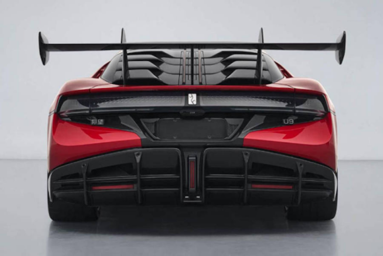 U9X前机舱盖采用双贯通设计,配备更大的前唇扰流板,两侧配有向下弯折的端板,整体布局增加了车头下压力。车身尺寸长宽高达到4991/2029/1351毫米,轴距是2900毫米。新车依旧采用跑车经典流线型设计,前翼子板呈现隆起样式,腰线则延伸至车尾部,与后轮拱形成起伏造型。新车标配20英寸双五辐式轮圈,四轮均匹配与佳通共同定制开发的GitiSport e·GTR2 PRO高性能半热熔轮胎,规格为325/35 ZR20(112Y),这是一款设计时速高达500km/h的高性能半热熔轮胎。新车还配备钛合金制动卡钳,并优化碳陶制动系统,增加面积的同时也提高了散热效率。新车后窗部分采用鳞片式多层结构,同时配备大尺寸鹅颈式扰流板,材质为碳纤维。尾灯组为双段式设计,后包围配备大尺寸双层扩散器装置。