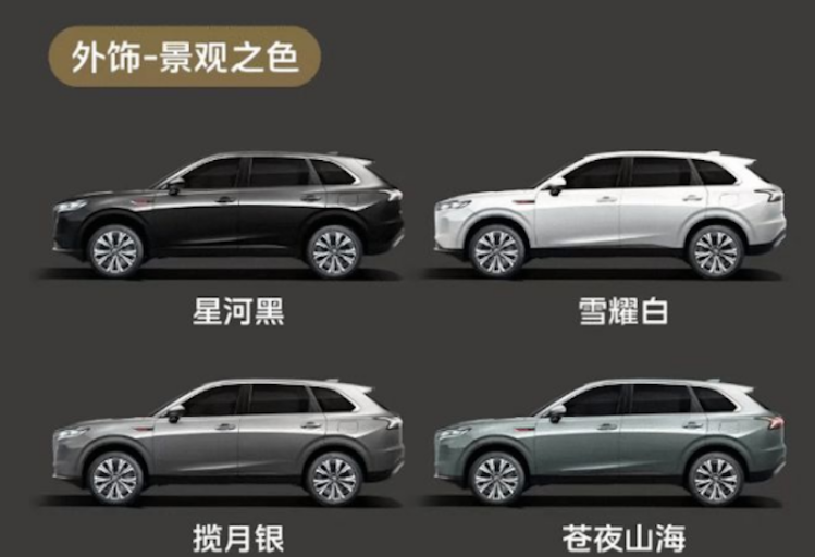红旗HS6 PHEV外观造型大气典雅,高山飞瀑式进气格栅采用封闭式设计,大灯狭长并带有镀铬装饰,搭配车头红旗LOGO,营造出气势感。车身上扬的腰线使得整车尺寸虽大但并不呆板。车门把手采用传统设计,车门也采用全包式设计,方便日常使用。新车长宽高分别为4925/1970/1740mm,轴距为2925mm。凤翎尾尾灯采用锐利切面晶体与渐变灯带相融合的设计,光影效果出色。新车提供四种外观颜色,分别为星河黑、雪耀白、揽月银及苍夜山海。