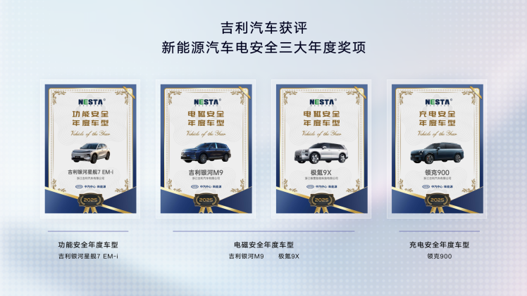 近日,在中汽中心新能源检验中心主办的第三届新能源汽车电安全大会上,吉利旗下多款车型斩获重磅荣誉:吉利银河M9、极氪9X获评“电磁安全年度车型”,领克900获评“充电安全年度车型”,吉利银河星舰7EM-i获评“功能安全年度车型”,充分彰显了吉利在电安全领域的领先地位与技术实力。