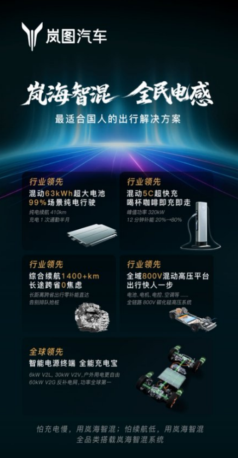 岚海智混,以岚图ESSA架构为基础,通过“智电中枢”“超能矩阵”两大技术体系让混动车全程电感,让混动出行进入电感十足的新时代。其中智电中枢,通过行业领先的智能温控管理系统、行业首创的智能能量管理系统,行业首创的智能电池管理系统,以及V2G功率全球第一的智能电源终端,用智能化的方案,提升补能效率,降低能耗,保障电池安全,全面提升新能源用车体验。另外,智电中枢赋能超能矩阵,在高端中大型混动车上,实现了超大电池、超级快充、超级高压、超级效能、超级续航技术的融合,让99%场景都能完全用电,充电速度媲美加油,跑长途也没有续航焦虑,让混动车全程电感。(资料来源:岚图汽车)