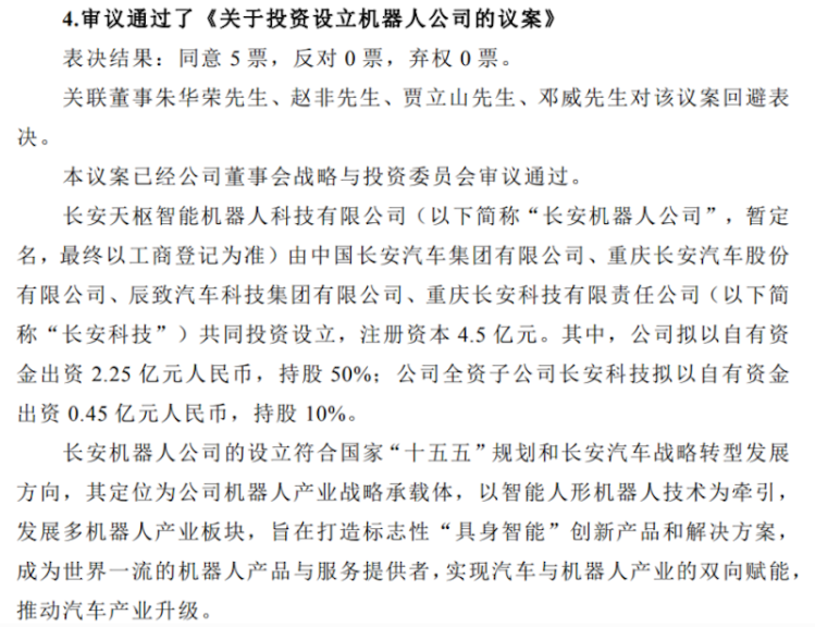 11月28日,长安汽车发布《第九届董事会第四十八次会议决议公告》,会议审议通过了多项议案,其中包括《关于投资设立机器人公司的议案》。议案显示:长安天枢智能机器人科技有限公司(简称“长安机器人公司”,暂定名)由中国长安汽车集团有限公司、重庆长安汽车股份有限公司、辰致汽车科技集团有限公司、重庆长安科技有限责任公司共同投资设立,注册资本4.5亿元。此举表明长安汽车机器人业务取得实质性进展。