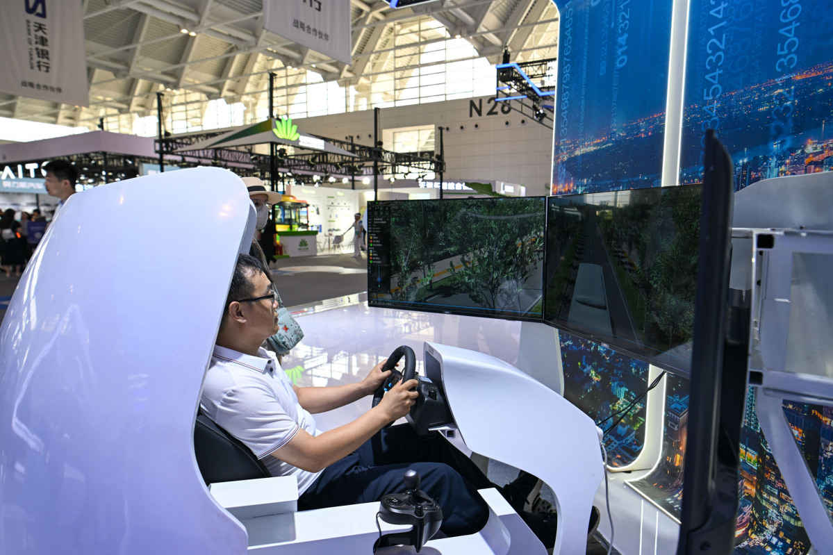 图为参观者在展会现场体验天津大学设计研发的一款可进行多场景智能网联车测试的仿真模拟器。(资料照片)