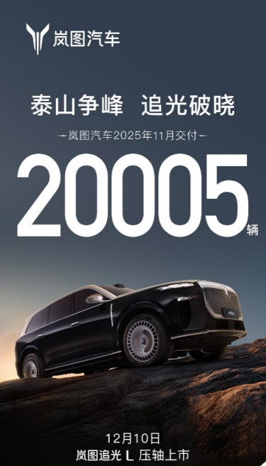 岚图汽车董事长、总经理卢放表示,“得益于广大用户的支持和信赖,岚图汽车11月交付量持续攀升,并成为国内首个达成30万辆的央国企高端新能源品牌,在新能源赛道上跑出‘岚图速度’。高端产品矩阵焕新升级,三旗舰重磅登场。岚图泰山上市后订单持续火爆,争锋豪华大六座SUV市场,岚图梦想家山河引领四座旗舰MPV进入智能豪华的全新时代,12月10日正式上市的岚图追光L将对豪华轿车市场发起冲击。岚图汽车始终坚持以用户需求为导向,打造央国企转型新标杆,彰显中国高端新能源品牌持续向上攀登的自信和实力。”