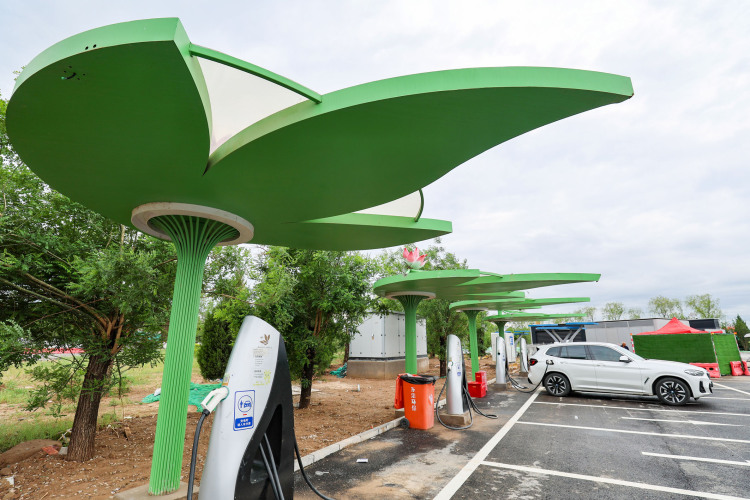 新能源车辆在京港澳高速河北段石家庄东服务区的充电区域充电。(资料照片)