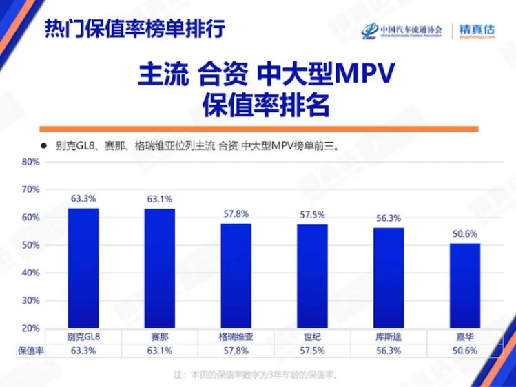 在主流合资中大型MPV市场,三年保值率数据清晰地展示出鲜明的格局分布。别克GL8位列保值率第一名,彰显其作为中国MPV市场“常青树”的持久价值与深厚的市场根基,丰田赛那、格瑞维亚凭借高效混动系统与出色的家用定位,保值率位列第二、第三名。