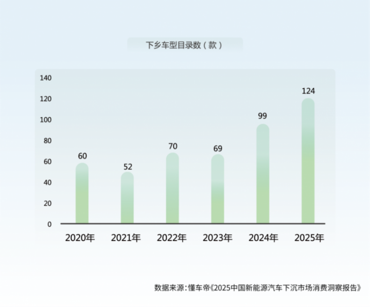 2020年以来,由工信部等部门牵头开展的新能源汽车下乡活动,成为打开这片蓝海市场的“金钥匙”;随着活动开展,支持政策逐渐深化、下乡车型持续增长、传播形式日益多元。2025年,新能源汽车下乡车型数量首次破百,达到124款;且覆盖越野、皮卡、轻卡等不同品类,呈现出明显的消费升级趋势和多元化趋势。