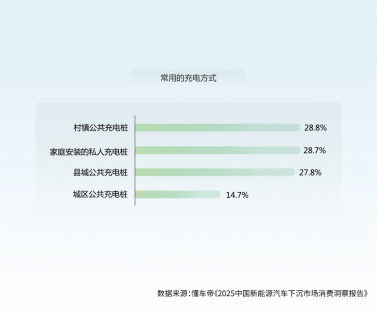 与维保情况类似,下沉市场充换电基础设施建设也相对不足。下沉市场用户中,使用公共充电桩充电的比例高达71.3%,有14.3%的用户日常要到远距离的城区公共充电桩充电;家庭私人充电桩拥有率仅28.7%。虽然近年来充电桩数量持续快速增长,但离“够用”仍有差距。