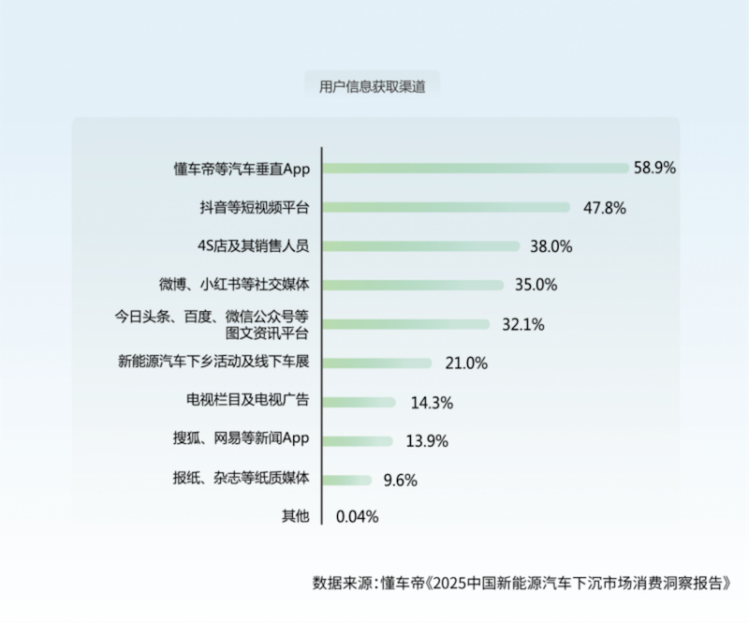 与城市用户相比,下沉市场用户在汽车选买、品牌偏好上都有自己的特点。由于媒体和销售渠道分散,下沉市场用户更依赖从线上获取信息,懂车帝等汽车垂直App及抖音等短视频平台是用户看车的首选渠道。“线上研究,线下体验”是下沉市场用户典型的买车场景,新事物在这里反而更容易被接纳。