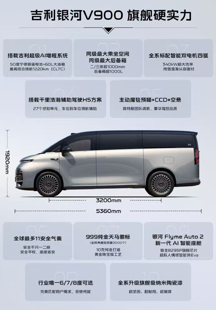 银河V900的上市,也让吉利银河补全了产品布局,从精品小车到豪华MPV,完成了对中国主流家庭需求的全覆盖。这也为2026年的下一个“百万银河“奠定了扎实的基础。(资料来源:吉利银河)