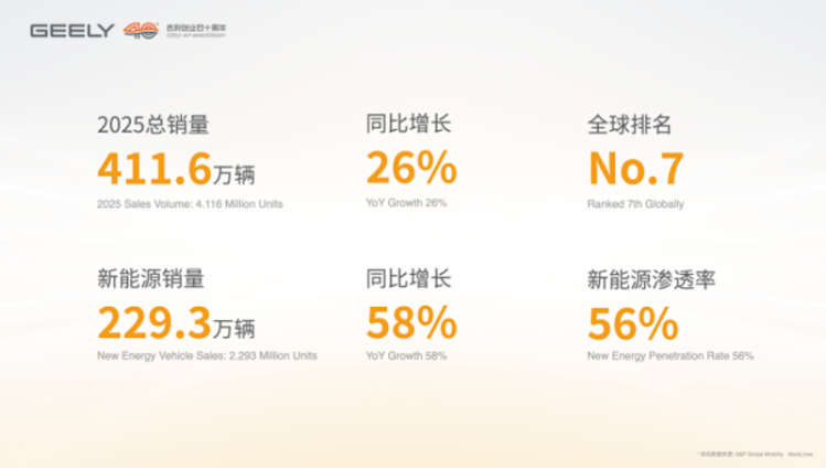 吉利发布的是一套以“品牌组合”为核心、以“全域技术”为支撑、以“全球协同”为脉络的体系化方案。吉利有底气提出2030目标。2025年,吉利控股集团总销量达411.6万辆,同比增长26%,首次突破400万辆大关。新能源汽车销量达到229.3万辆,同比激增58%,渗透率直接冲到56%。吉利控股全年销量排名全球第七。亮眼成绩的背后,是其深入践行《台州宣言》战略,进行“一个吉利”的大刀阔斧的改革、推动品牌向上、科技向新、全球化向前的结果。