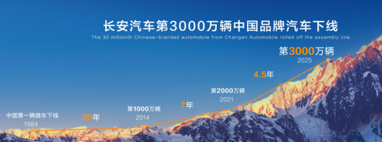 更值得关注的是,2025年12月,中国长安迎来了第3000万辆中国品牌汽车下线。1984年进入造车领域,从第一个千万辆的三十年沉淀,到第二个千万辆的七年奋进,再到第三个千万辆的四年半跃迁,长安用安全可靠的产品“让安全回家,点亮万家灯火”。